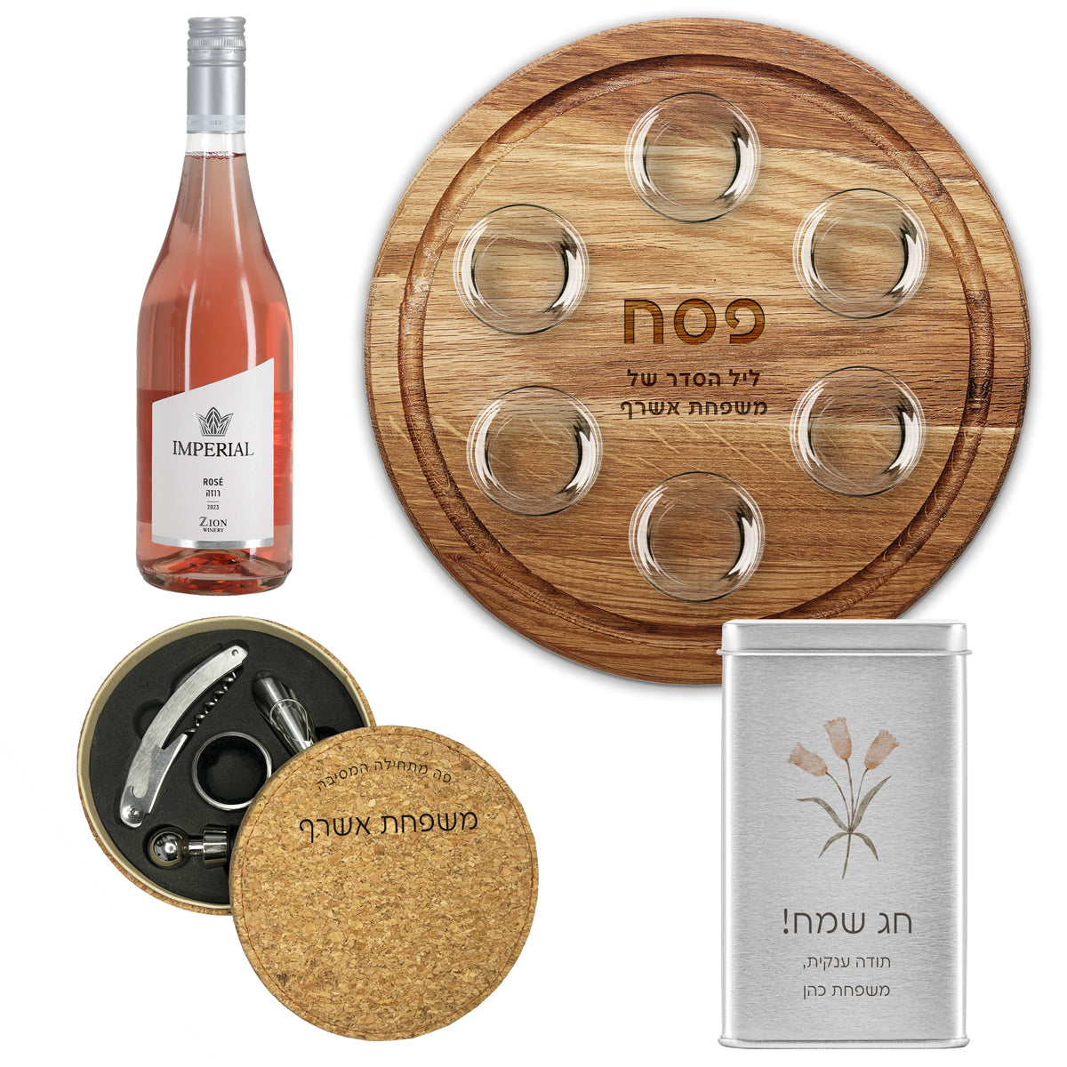מארז לפסח - קערת ליל הסדר מעץ - סט אביזרי יין - מארז שוקולד - בקבוק יין קטן - אביב