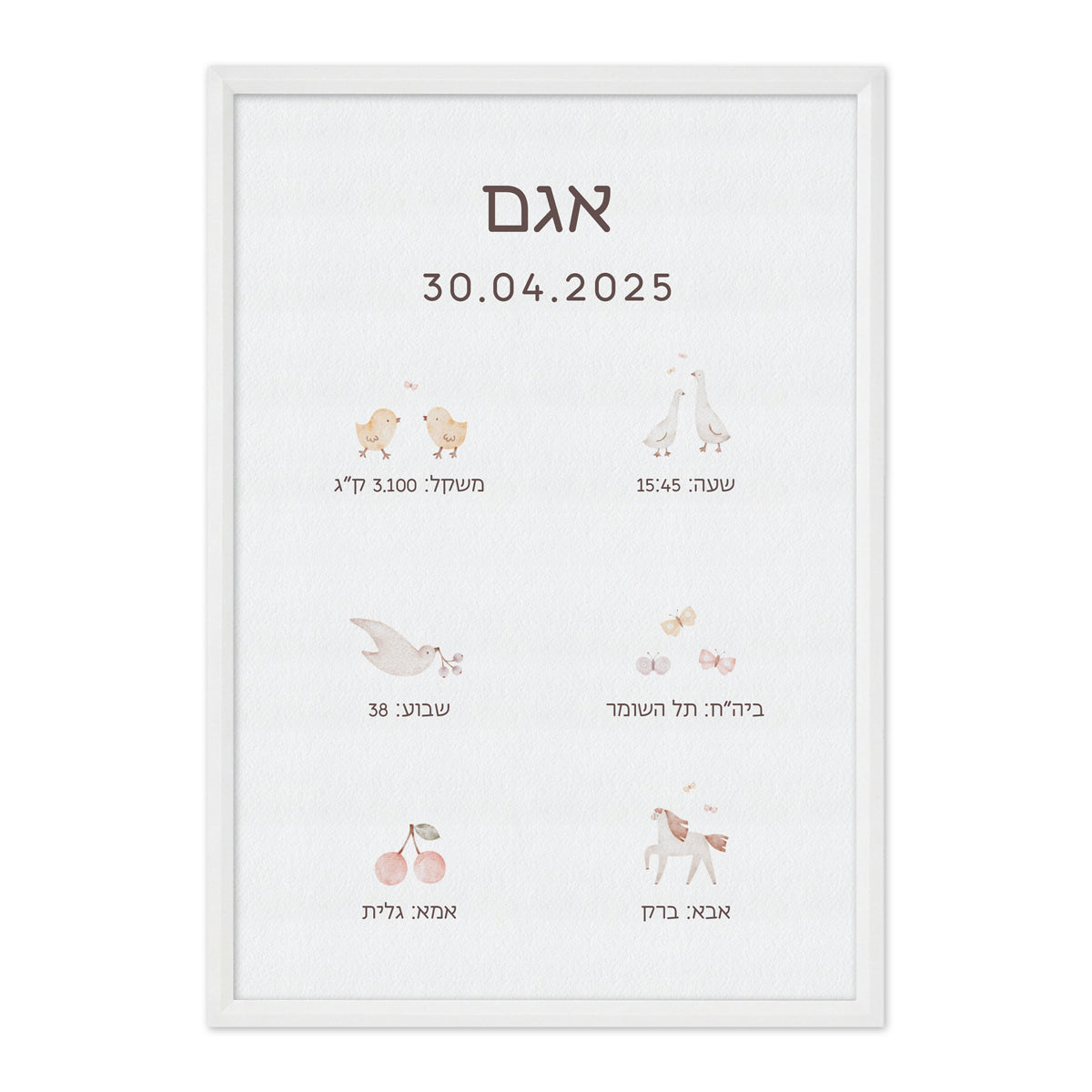 כל הפרטים הקטנים של היום הכי גדול נאספים לתמונה אחת מרגשת שאפשר לתלות לקישוט בחדר הילדים או להעניק כמתנה מקורית ליולדת הטריה: השם של הנסיך או הנסיכה הקטנים והתאריך שבאו לעולם, שמות ההורים והאחים המאושרים, שבוע ההריון, השעה המדויקת והמקום שבו התרחש הפלא, והמשקל של כל המתיקות הזו.