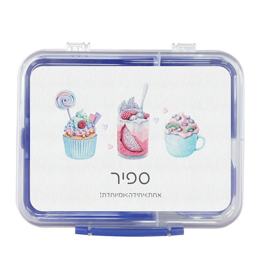 • קופסה שקופה עם סוגר וחלוקה בצבע כחול.