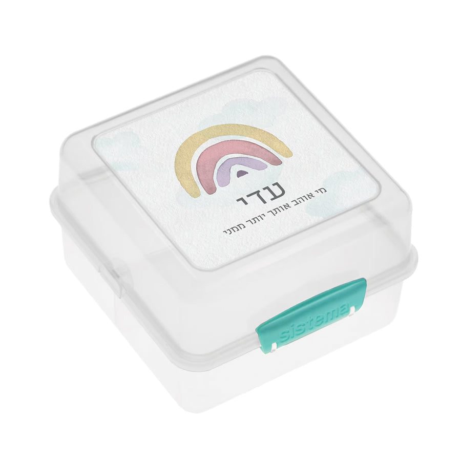 קופסת אוכל מחולקת ומעוצבת בדגם קשת בענן עם שם הילד, מבית המותג הניו-זילנדי Sistema, שעושה תיאבון!