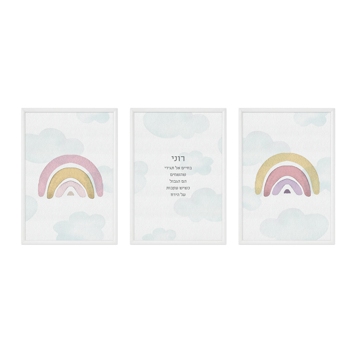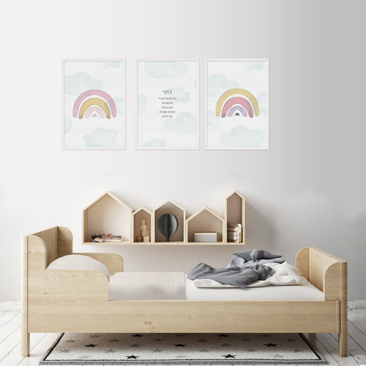 פוסטרים לחדר ילדים בדגם קשת בענן שיהפוך כל חדר ילדים לפינה אישית, חמימה וחלומית.