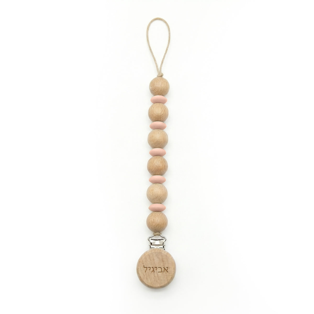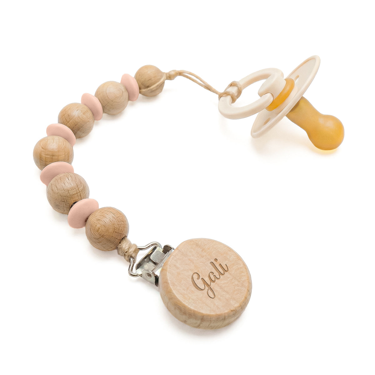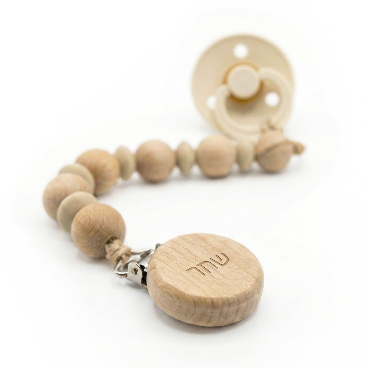 מחזיק מעוצב למוצץ מעץ עם חריטת לייזר אישית עם שם התינוק כדי שתמיד תדעו איפה הוא נמצא.