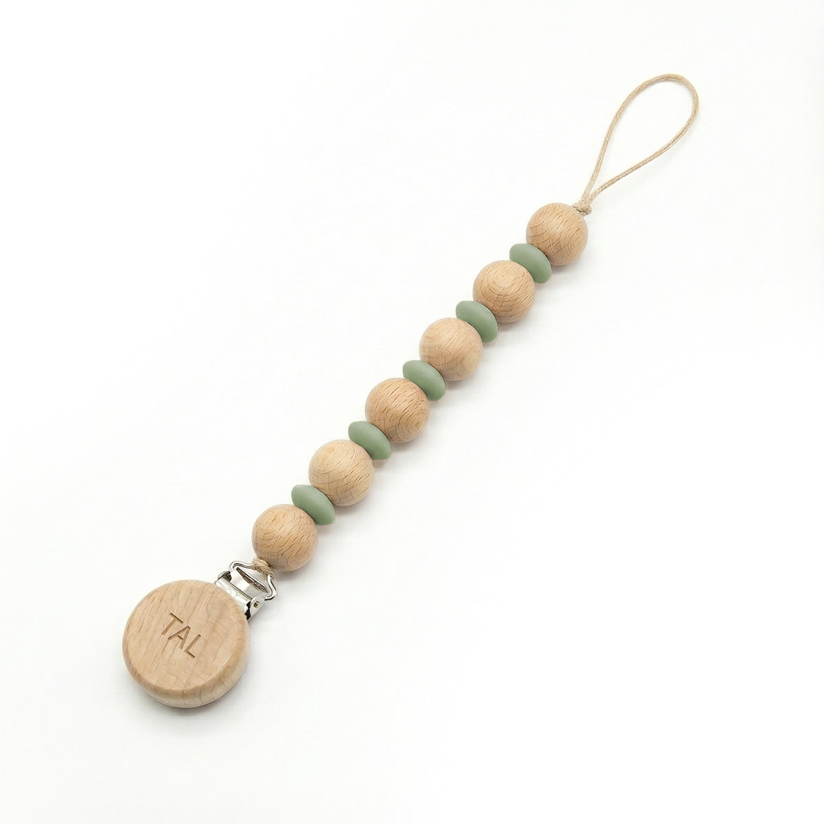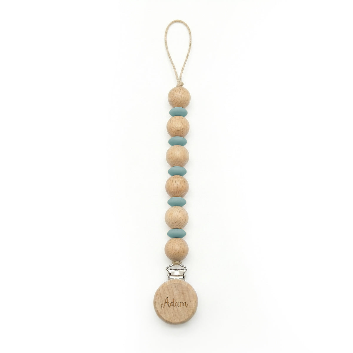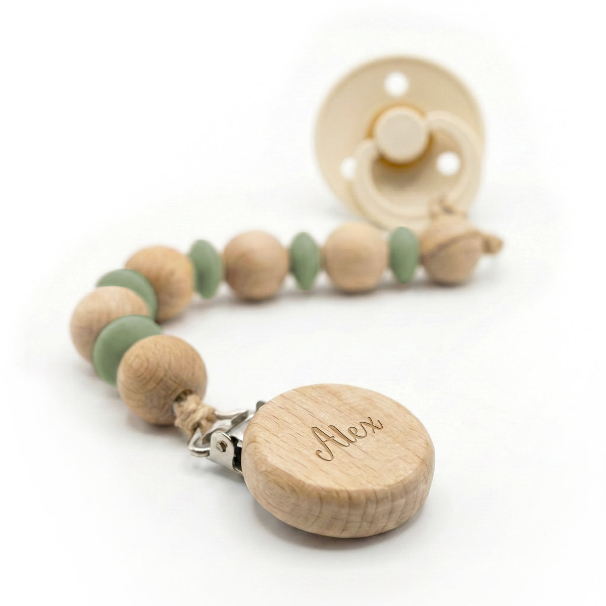 מחזיק מעוצב למוצץ מעץ עם חריטת לייזר אישית עם שם התינוק כדי שתמיד תדעו איפה הוא נמצא.
