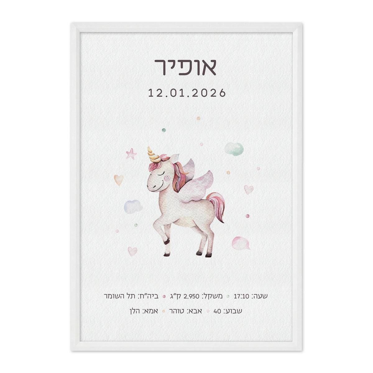 תעודת לידה מעוצבת בדגם חד קרן כדי לנצור את הרגע המדויק והמיוחד שבו המשפחה התרחבה.
